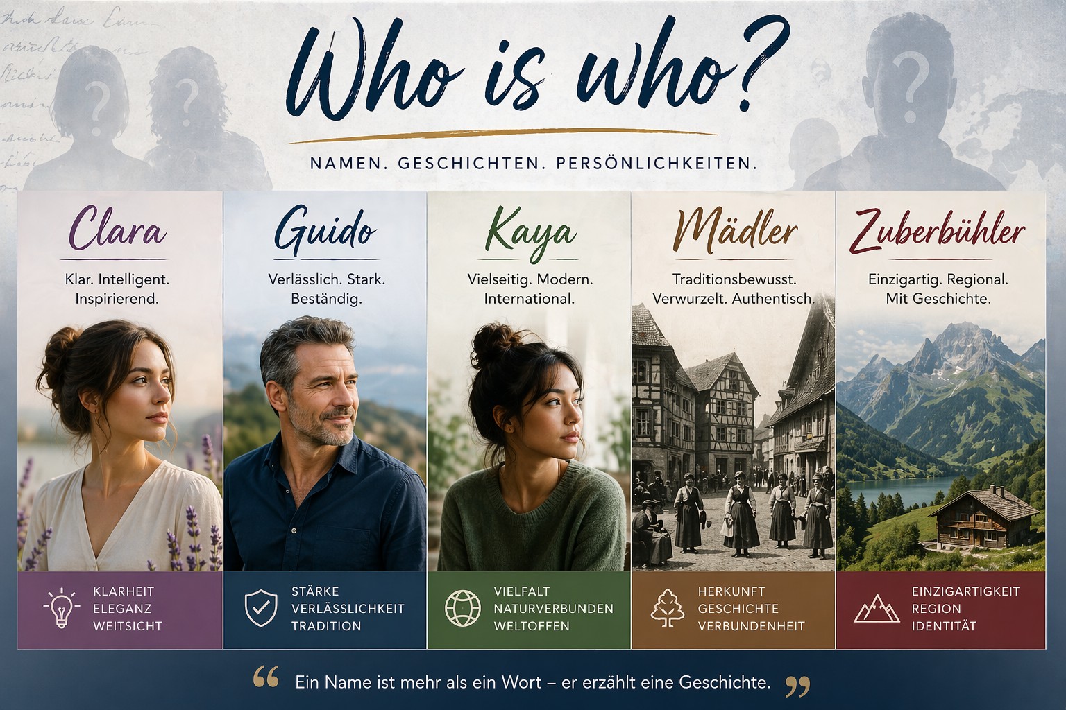 Wer ist wer? Diese scheinbar einfache Frage begleitet uns ein Leben lang. Namen sind mehr als nur Bezeichnungen – sie tragen Geschichte, Persönlichkeit und oft auch ein Stück kulturelle Identität in sich. In diesem Beitrag werfen wir einen Blick auf bekannte Namen wie Clara, Guido, Kaya, Mädler und Zuberbühler und erkunden, was sie über Herkunft,… Continue reading Who is Who? – Namen, Identität und Bedeutung im Wandel der Zeit